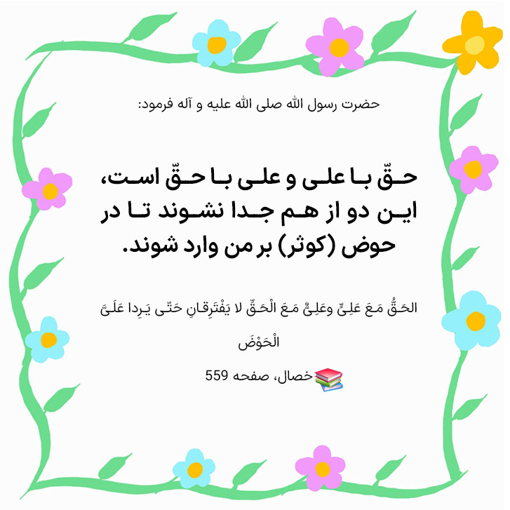 حدیث جدایی ناپذیری حق از حضرت علی دیدگاه خود را بنویسید / احادیث، عکس نوشته / از نور حسین حضرت رسول الله صلی الله علیه و آله: حقّ با علی و علی با حقّ است، این دو از هم جدا نشوند تا در حوض (کوثر) بر من وارد شوند 📚خصال، صفحه ۵۵۹ الحَقُّ مَعَ عَلِیٍّ وعَلِیٌّ مَعَ الْحَقِّ لا یَفْتَرِقانِ حَتّی یَرِدا عَلَیَّ الْحَوْضَ